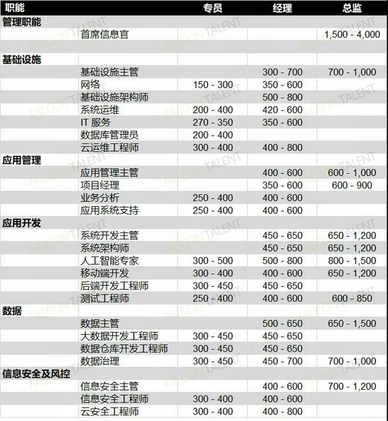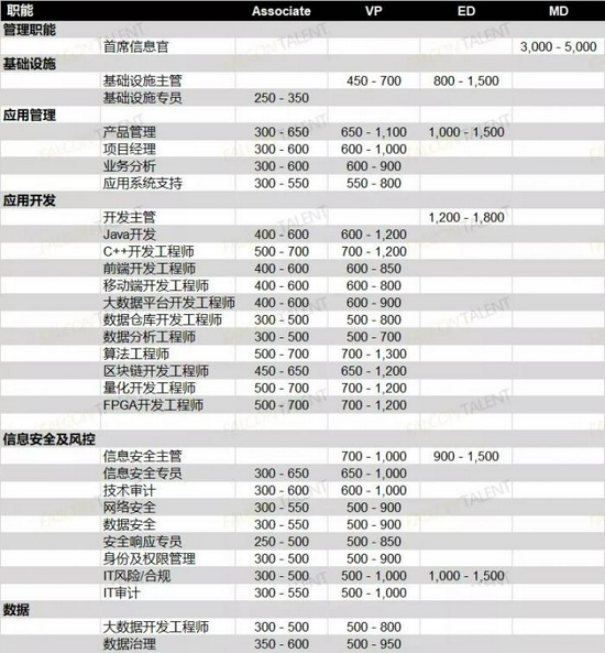 外资资管方面,在国内基金公司控股权外资持股比例放宽政策下,外资资管巨头加快了布局中国市场的步伐。因业务牌照申请阶段,IT是首要设立的部门之一,所以外资基金技术部门的标准配置是IT负责人+基础架构+系统支持/项目管理+信息安全。而熟悉恒生系统运营管理且英文流利的IT负责人选,是近两年紧缺的人才,总经理级IT负责人年薪达100万元到200万元间。