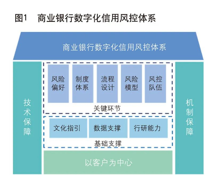 对商业银行而言,数字化信用风控是通过数字技术重塑信用风控的系统和流程,实现流程自动化、决策自动化、智能监测与风险预警,提高风险管理的效能效率。构建数字化信用风控体系,必须明确核心支点、保障要素、基础支撑和关键环节(如图1),其中,客户是数字化信用风控的中心支点,技术和机制则是贯穿数字化信用风控体系始终的保障因素。