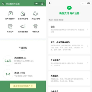 就目前操作流程而言,记者通过手机扫码进入自助申请页面,页面显示“活动费率0.6%”“资金T+1到账”等开通须知提示。进入商户注册界面,可以发现微信收款码商业版一共向5种主体类型开放注册,分别是企业,党政、机关及事业单位,个体工商户,其他组织(如社会团体、民办非企业、基金会)和小微商户,各主体类型在申请时需要准备的材料也存在区别。