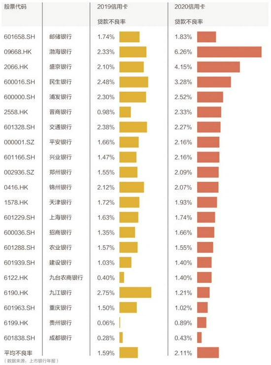 其中,渤海银行在 2020 年信用卡贷款不良率达到 6.26%,同比增加 168.67%,在各银行中位列第一;盛京银行信用卡贷款不良率也达到了 4.15%,位列第二。