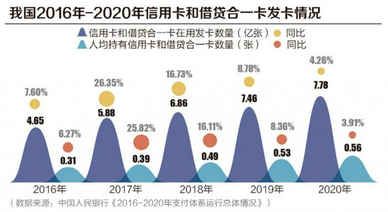 2017-2018 年,银行信用卡业务迅速拓展。2017 年末,我国信用卡和借贷合一卡合计发卡量为 5.88 亿张,同比增幅26.35%;2018 年 末,发量达到6.86亿张,依然保持了16.73% 的增幅。但自 2019 年起,信用卡发卡进程明显放缓,2019-2020 信用卡和借贷合一卡发卡量仅合计增加0.92亿张,仅相当于2018年一年的新增发卡量。
