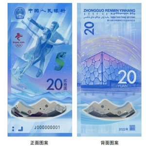 正面主景为自由式滑雪运动员图案,上方为中华人民共和国国徽、“中国人民银行”行名,右侧为第24届冬季奥林匹克运动会会徽、面额数字“20”与汉字“贰拾圆”,下方为动感全息图案、盲文面额标记和冠字号码。