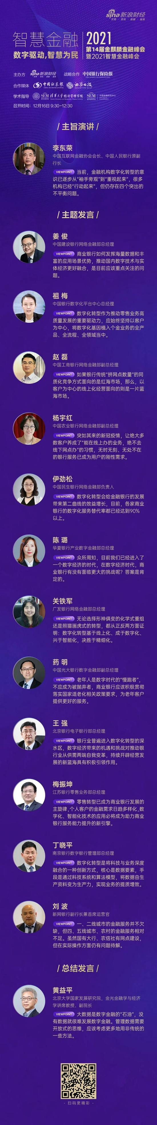 由新浪财经主办的“第14届金麒麟金融峰会”于12月13日-17日隆重举行,主题论坛“2021智慧金融峰会”今日召开。中国互联网金融协会会长、中国人民银行原副行长李东荣,北京大学国家发展研究院金光金融学与经济学讲席教授、副院长黄益平携手12位银行业翘楚共议智慧金融发展新趋势。