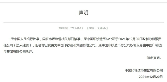 12月10日,原中国印钞造币总公司宣布,经中国人民银行批准,国家市场监管相关部门核准,公司于2021年12月20日改制为有限责任公司(法人独资),现名称已变更为中国印钞造币集团有限公司。原中国印钞造币总公司权利义务由中国印钞造币集团有限公司承继。