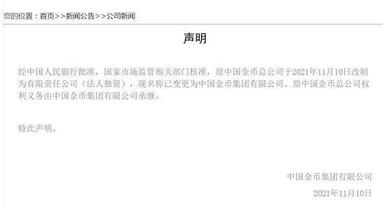 11月10日,原中国金币总公司发布声明宣布,经中国人民银行批准,国家市场监管相关部门核准,公司于2021年11月10日改制为有限责任公司(法人独资),现名称已变更为中国金币集团有限公司。原中国金币总公司权利义务由中国金币集团有限公司承继。