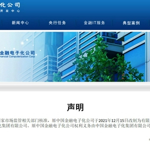 22日,中国金融电子化公司(下称“中国金电”)官网发布声明称,经中国人民银行批准,国家市场监管相关部门核准,公司于2021年12月15日改制为有限责任公司(法人独资),现名称已变更为中国金融电子化集团有限公司。
