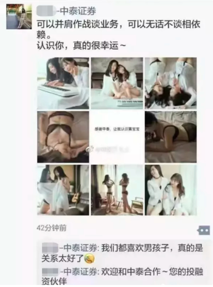无独有偶,中泰证券的某女销售也在朋友圈里发了一组大尺度的与同性友人的“写真”, 满满百合剧双女主风,并配文“可以并肩作战谈业务,可以无话不谈相依赖”,同时不忘在评论区回复大家“欢迎和中泰合作,您的投融资伙伴”。