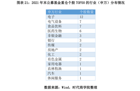 图表21:2021年末公募基金重仓个股TOP50的行业(申万)分布情况