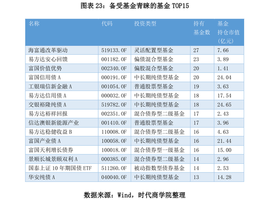 数据显示,2021年,最受基金机构欢迎的公募基金分别为为海富通改革驱动、易方达安心回馈、富国价值优势、富国信用债A,购买这些基金的基金在20只以上,分别有27只、23只、20只、20只。