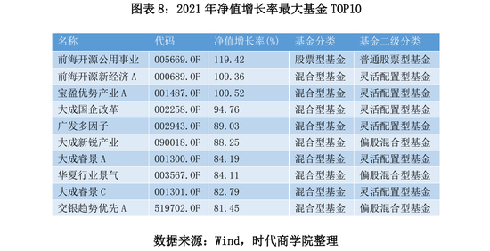 时代商学院认为,2021年净值增长率排名居前的基金,其高收益一定程度上是“时势”所造就。2022年,其搭乘的“风口”不一定持续,它们的业绩恐怕难以维持在顶尖水平。