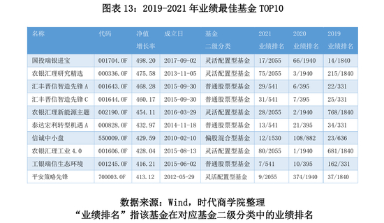 图表12:2021年业绩TOP10基金在过往年份的业绩排名