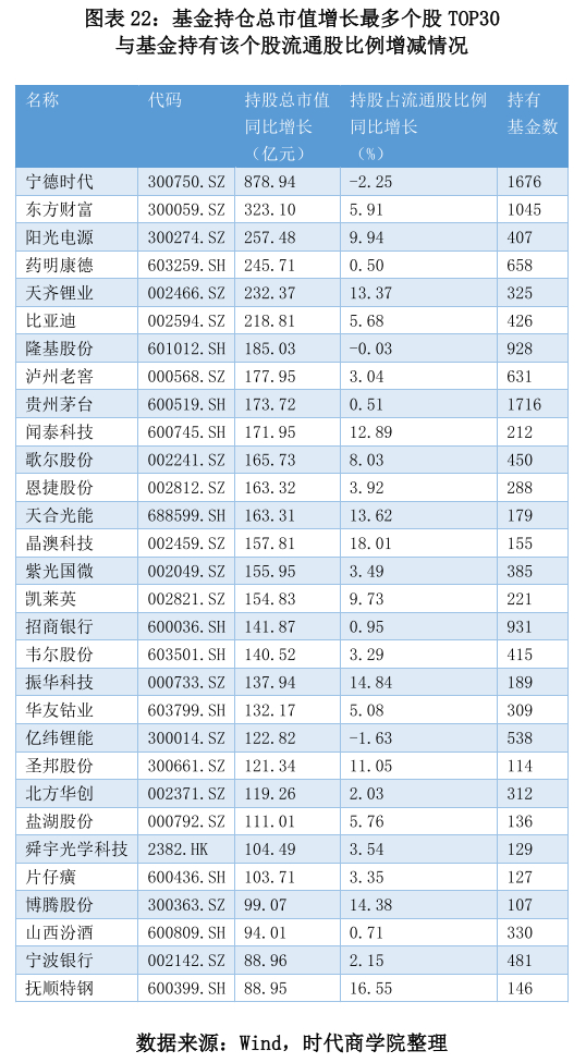 数据显示,截至2021年末,公募基金持有个股中,总市值增长最多的前五只个股分别是宁德时代、东方财富、阳光电源、药明康德、天齐锂业,公募基金持股总市值分别相比2020年末增长878.94亿元、323.10亿元、257.48亿元、245.71亿元、232.37亿元。