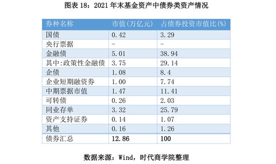 债券类资产中,公募基金持有最多的是金融债,占债券类总资产的38.94%,其次是同业存单与中期票据市值,分别占债券类总资产的25.79%与11.41%。