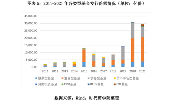 图表5:2011-2021年各类型基金发行份额情况(单位:亿份)