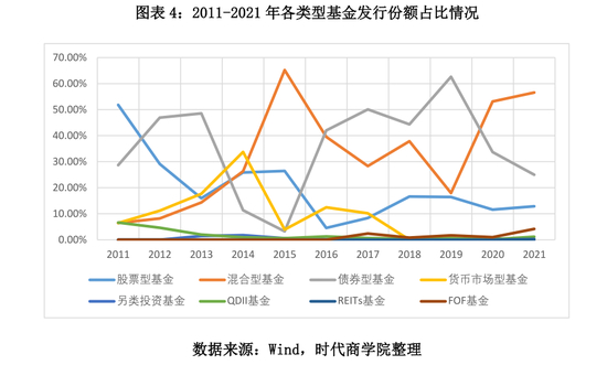 数据显示,2011-2021年十一年间,新发行基金种类占比出现了较大的变化。2021年,发行量最多的基金类型是混合型基金;但在2011年,发行数量最多的基金类型是股票型基金。