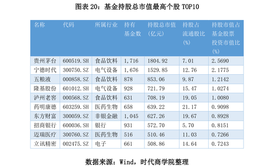 数据显示,截至2021年末,公募基金持股总市值最多的前五家上市公司分别为贵州茅台、宁德时代、五粮液、隆基股份、泸州老窖,公募基金持股市值分别为1804.92亿元、1529.85亿元、853.06亿元、721.79亿元、708.19亿元。