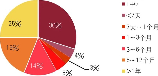 高流动性仍是银行理财客户的主要理财需求之一。截至2021年上半年,“T+0”产品最受投资者青睐,持有数量和金额占比分别达到46%和30%,而半年及以下期限的理财产品数量和金额占比为72%和56%(见图4、图5)。