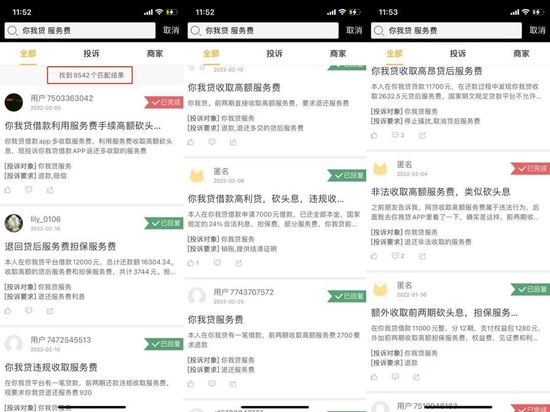 中国网财经记者注意到,你我贷在黑猫投诉平台的累计投诉量已经高达3.5万条,并仍在持续更新。而记者以“你我贷 服务费”在黑猫投诉平台搜索,匹配的结果竟达8542条。投诉中表达的信息包括但不限于:“下款前不知道有服务费”、“无明显告知”、“增加贷款成本”、“变相砍头息”等。