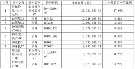 截至2021年三季度末,产品前十大持仓资产主要为高评级私募公司债、城投债和非标资产,其中两笔非标资产投资合计占产品总资产超35%,均为基建类债权资产。非标资产中,“信托贷款-水电九局”为第一大持仓,占比高达27.63%,年化收益率为6%,融资客户为中国水利水电第九工程局,交易结构为信托贷款;“基金计划-福建一建”为第八大持仓,占比达8.25%,年化收益率5.7%,融资客户为福建一建集团,交易结构为其他非标准化债权类投资。
