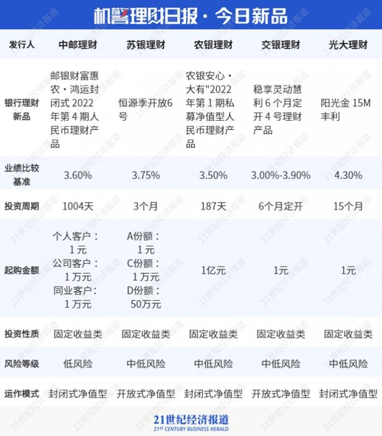 南财理财通课题组选取5只近期发售新品供参考。据南财理财通数据显示,近期中邮理财“邮银财富惠农·鸿运封闭式 2022年第4期人民币理财产品”值得关注。该产品业绩比较基准为3.6%,投资性质为固定收益类,运作模式为封闭式净值型,该产品个人客户起购金额为1元,公司客户为1万元,同业客户为1万元,风险等级为低风险。该产品的募集期为2022 年3月14日至3月27日。