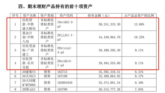 根据最新一期投资报告(2021年三季报),在对底层资产穿透后,该产品56.22%的资金投向债券,41.65%的资金投向非标资产,即产品收益主要源于固收类资产,尤其是非标资产中的基建类项目贷款。