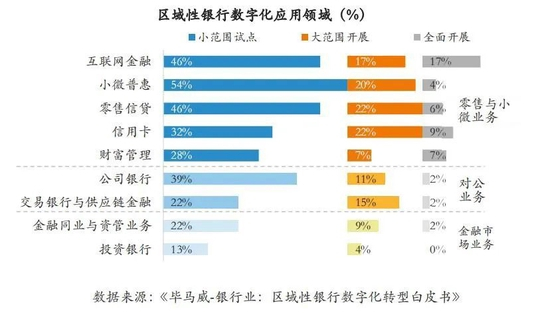 同时,不同类型调研银行的数字化能力差异显著,国有大型商业银行、股份制商业银行、新型互联网银行数字化能力相对较高,城商行、农商行数字化能力相对较低。大型银行全面转型初级阶段已基本完成,中小型银行多处于规划和试点阶段,且集中在零售与小微业务领域。
