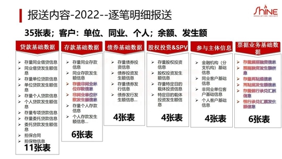 依据2020年7月份人民银行下发的《中国人民银行关于建立金融基础数据统计制度的通知》(银发﹝2020﹞164号)(简称“金数”)和《中国人民银行关于2022年金融基础数据统计有关事项的通知》(银发﹝2022﹞10号文)文件要求,以金融机构会计科目和各类账户信息为基础,目前发布了35张报表,分别以贷款基础数据(11张表)、存款基础数据(6张表)、债券业务基础数据(4张表)、股权与SPV投资基础数据(4张表)、参与主体信息(4张表)、票据业务基础数据(6张表)合计6个主题的统计标准。