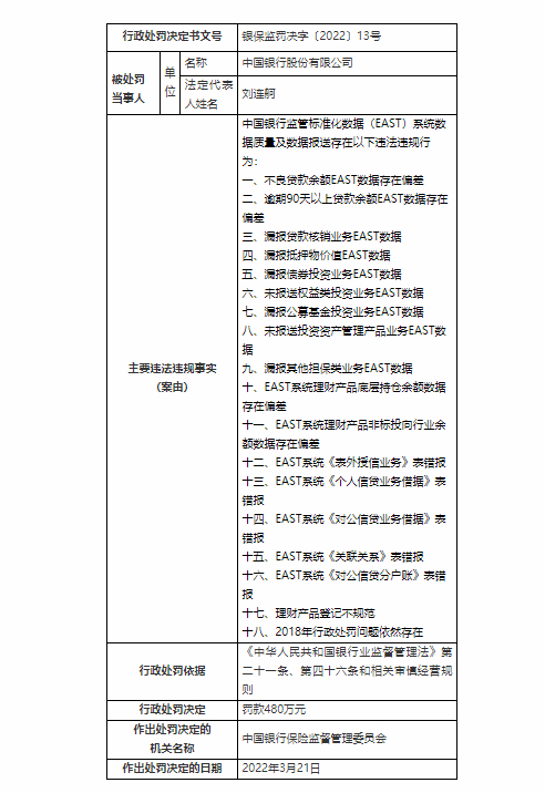 日前,银保监会网站发布消息,银保监会近期严肃查处一批监管标准化数据(EAST)数据质量领域违法违规案件,对政策性银行、国有大型银行、股份制银行等共21家银行机构依法作出行政处罚决定,处罚金额合计8760万元。