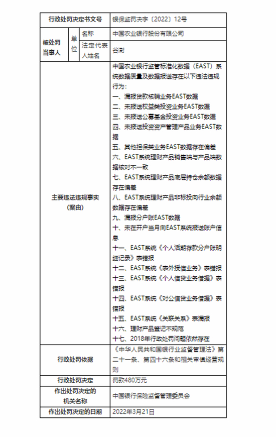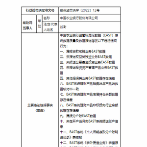 具体来看,政策性银行中,农发行收到的处罚金额最高,为480万元。罚单显示,农发行监管标准化数据(EAST)系统数据质量及数据报送存在17违法违规行为。