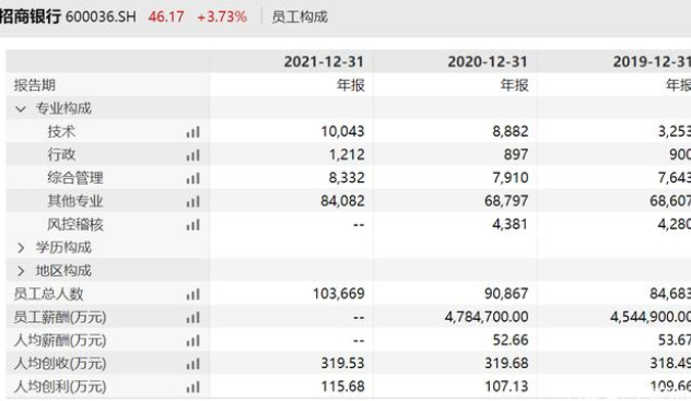 年报披露,招行2021年薪酬总额为587.28亿元,招行员工增加至10万以上,达到103669人,比2020年末增加1.28万人以上,人均薪酬就是56.65万元,和2020年的人均薪酬相比有明显提升,人均增加大约4万元,仅仅次于2018年的57.71万元人均薪酬,公司历史第二高。