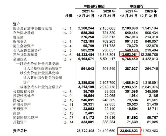 从资产负债表来看,中国银行2021年的总资产规模为23.55万亿,较上年同比增长10.22%;其中13.65亿用于发放贷款和垫款,占总资产规模的近六成。