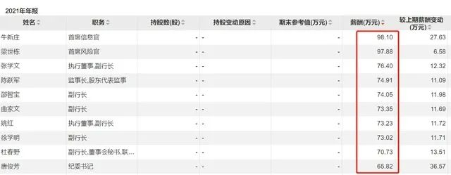 值得一提的是,邮储集团在2021年为员工发放的工资合计416.18亿元,员工人均年薪为23.35万元,较上年有所增长;公司高管年薪在50万-100万元浮动,较上年均有不同幅度的增长。