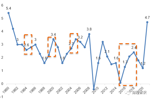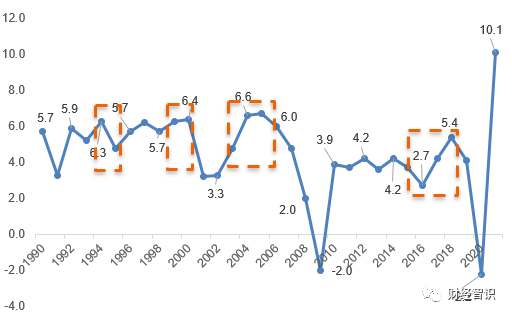 90年代以来美国进入繁荣期,叠加互联网的新经济快速发展,1999年的加息对经济的冲击较大,直接导致了互联网新经济的泡沫破裂,随后,2000年GDP增速从6.4%快速掉落到只有2001年的3.3%左右。2000年后美联储降息处理通缩压力,2002年经济开始恢复。2015年加息的时候,3轮QE大幅提振了企业盈利,GDP增速也从2016年的底部2.7%攀升到了2018年的5.4%。