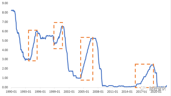 第二轮加息周期从1999年6月开始, 2000年5月结束,周期近1年,基准利率从4.75%上调到6.5%,对应KBW银行指数下跌了14%,同期的标普500指数却是上涨6.7%左右,当年的97亚洲金融危机推迟了加息周期,但是当时的经济已经过热,1999年启动加息时,美国已经处于经济过热的后半段,互联网为主的新经济公司吸引大量资金,不断推动经济和股市走向高点,纳指在加息周期中上涨了近50%,而银行股大幅跑输大盘。