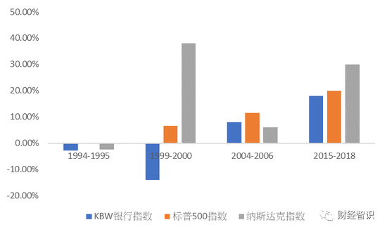 2004年6月到2006年6月期间开启了第三轮加息周期,24个月内加息17次,基准利率从1%抬升到5.25%,这一轮周期中KBW银行指数录得8%的上涨,同时标普500涨幅是11.6%,纳指也有6%的上涨。