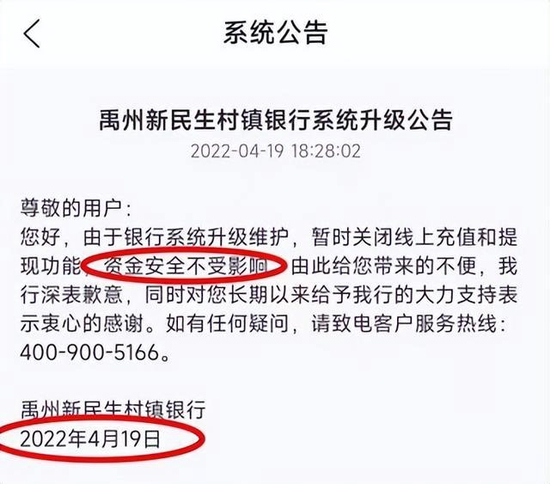 与此同时,4月25日,许昌市人民政府就“禹州新民生银行线上储户取款难”问题回复相关网友:“近期有不法分子利用禹州市新民生村镇银行线上渠道进行诈骗。为有效阻断不法分子诈骗行为,禹州市新民生村镇银行正在升级优化线上渠道系统,前期已发布公告。目前,禹州市新民生村镇银行各营业网点均可正常办理业务,一切合法储蓄存款受法律保护,请您耐心等候通知,涉及其他问题的,由有关部门正在调查处理中。”