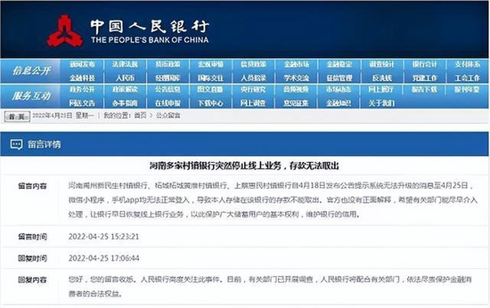 4月25日,央行在“公众留言”一栏对网友的相关问题进行了回复。央行回复称,“人民银行高度关注此事件。目前,有关部门已开展调查,人民银行将配合有关部门,依法尽责保护金融消费者的合法权益。”