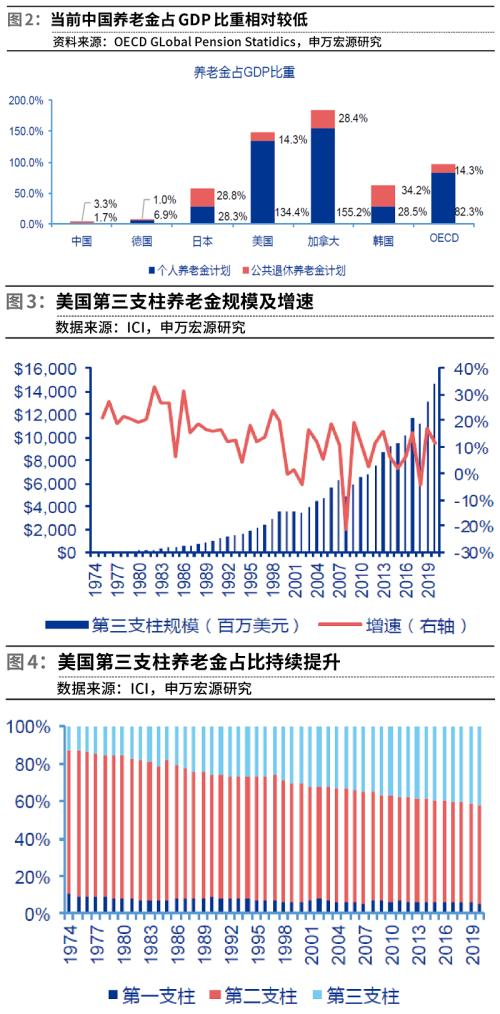 申万宏源证券表示,当前中国养老金占GDP比重相对较低,截至2020年末中国个人养老金计划和公共退休养老金计划合计占GDP的比重仅为5.0%,同期美国的这一比重达到了148.7%,加拿大183.6%,德国7.9%;日本和韩国这一比重分别是57.1%和62.7%。同时,中国三支柱发展极为不平衡,第三支柱仍处于初步探索阶段。