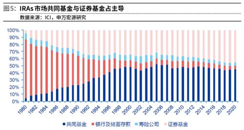 申万宏源认为,美国共同基金成为IRAs的主要资金流向的原因有四点。一是共同基金多样化基金产品能够为养老金计划参与者提供不同风险报酬特征的产品,投资者可依据自身财富、年龄和风险承受能力等自行选择;二是共同基金能提供基金之间转换权,方便投资者根据市场行情调整投资决策;三是共同基金信息披露充分透明,共同基金有义务提供招募说明书、年报等文件且主要日报都会登载基金每日报价,方便投资者跟踪养老基金管理绩效;四是共同基金相比其他类型投资更易被接受,因为其在提供投资决定所需的教育材料和信息资源、资产分配服务方面有丰富的经验,成为了普通民众获得专业化投资管理最简便、经济的途径。