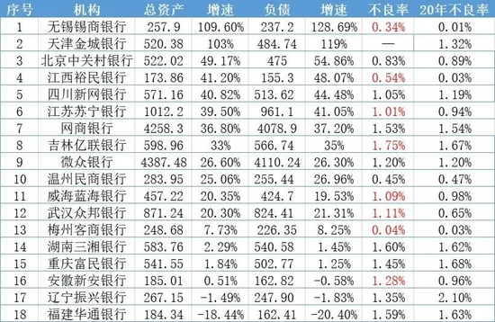 记者注意到,去年锡商银行、江西裕民银行、武汉众邦银行等多家处于行业中后部位置的民营银行不良率增长幅度较大。而上述指标的变化或和银行的业务快速扩张有关。例如,2021年,锡商银行资产总额、贷款余额等多项业绩指标均三位数增长。