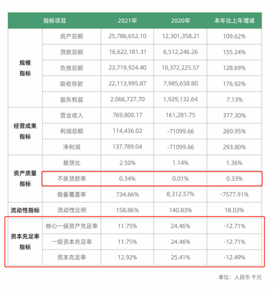 以锡商银行为例,据悉,该行去年多项业绩指标均三位数增长。数据显示,截至2021年末,锡商银行资产总额257.9亿元,同比增长109.6%;其中各项贷款余额166.2 亿元,同比增长155.3%;负债总额237.2亿元,同比增长128.69%;各项存款余额219.7亿元,同比增长175.1%。