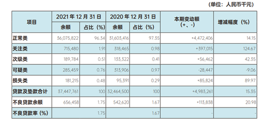 而截至2021年末,亿联银行不良贷款率从2020年末的1.67%上升0.08个百分点至1.75%,其涨幅也在18家银行中排第一位。年报显示,亿联银行截至2021年底的不良贷款余额为6.56亿元,较上年的5.43亿元增加了1.13亿元,增幅为20.98%。