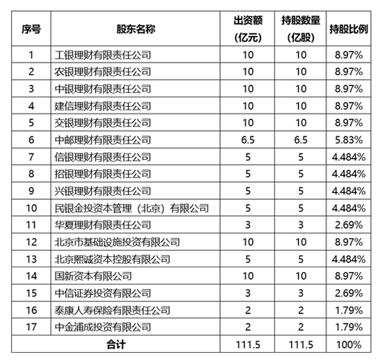 雄厚的注册资本来自阵容堪称豪华的17家股东。从银保监会开业批复公布的股权结构表可以看到,这17家股东包括工、农、中、建、交、邮储等六家国有大行以及中信、招商、兴业、民生、华夏等五家股份行旗下的理财子公司,保险公司、证券公司、央企金融服务平台、地方国资运行平台旗下公司等。