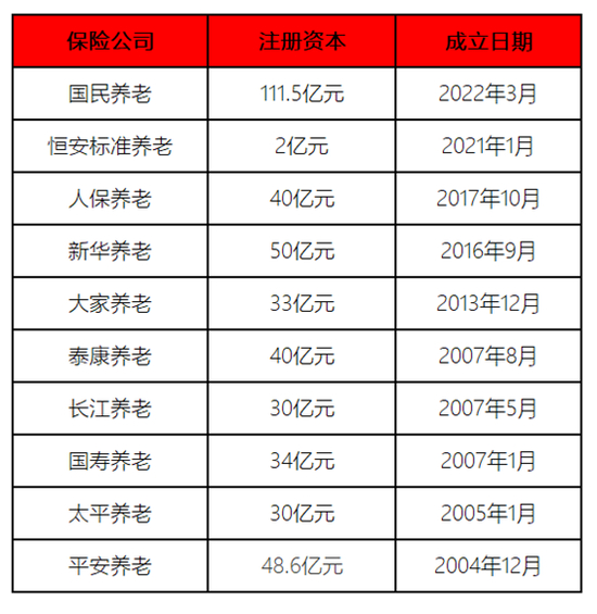 此前9家中,注册资本最高为新华养老50亿元,人保养老、泰康养老、平安养老均超过40亿元,恒安标准养老注册资本最低为2亿元。