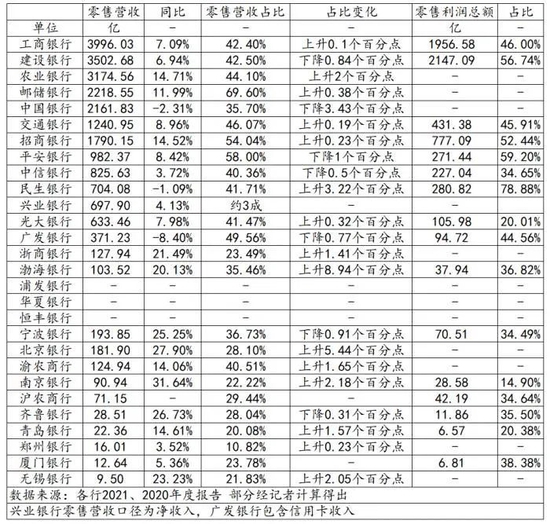 在记者统计的44家银行之中,有19家未能获得可比的零售营收和占比数据,其中包括浦发、华夏、恒丰银行3家股份行以及包含重庆银行、江苏银行、上海银行等在内的16家城、农商行。
