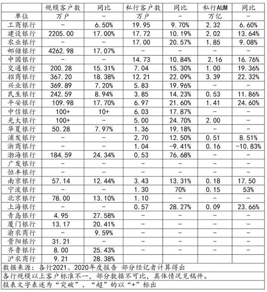 当前,银行业普遍以客户金融资产规模进行客户分级,使用的指标通常有月日均金融资产、日均金融资产等,各个级别的门槛则各不相同。本次统计以年报中明确的最低门槛作为规模客户数进行统计。