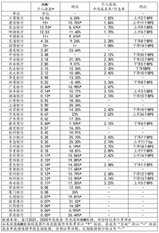 从年报数据来看,部分银行以AUM为论述主体,部分银行、特别是中小银行仍然以个人存款为论述主体。这也一定程度上说明了财富管理转型是一场由大行发起并引领,中小银行跟随的行业变革。总体来看,AUM和个人存款规模普遍增长。