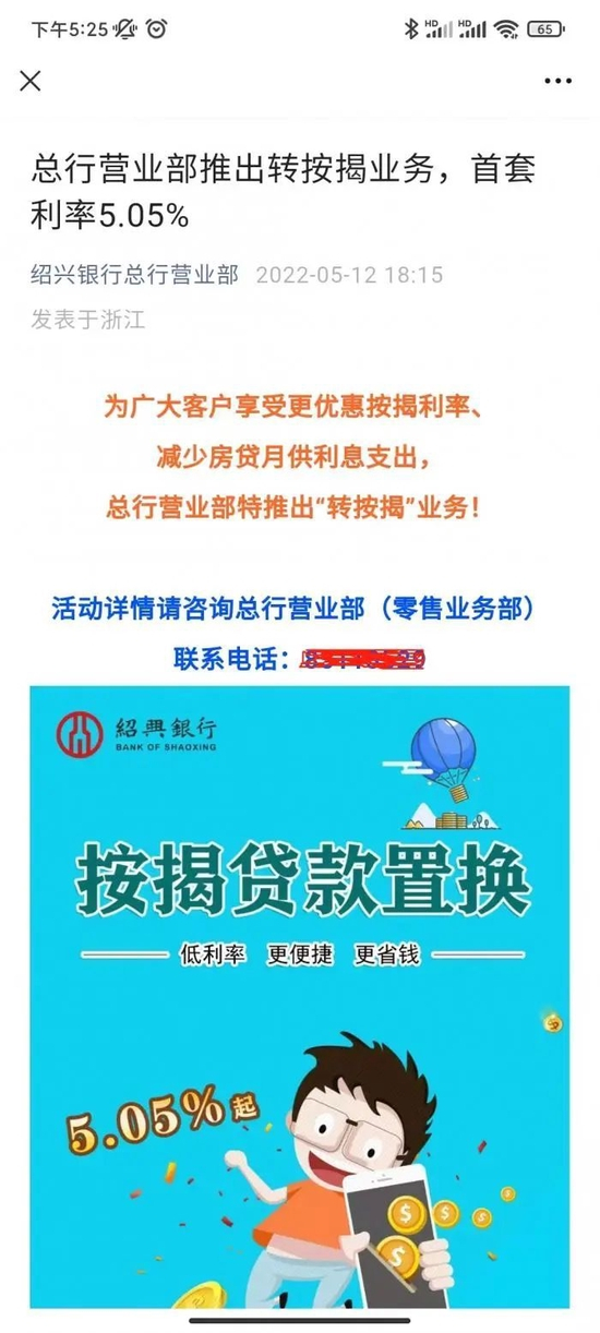 记者发现,有部分小银行已经开始谋求吃下这部分“蛋糕”。浙江省的绍兴银行总行营业部官方微信公众号5月12日官方推送显示:为广大客户享受更优惠的按揭利率、减少房贷月供利息支出,特别推出“转按揭”业务,并附上一张以“按揭贷款置换”为标题的海报。海报显示,置换后的房贷利率最低可至5.05%。