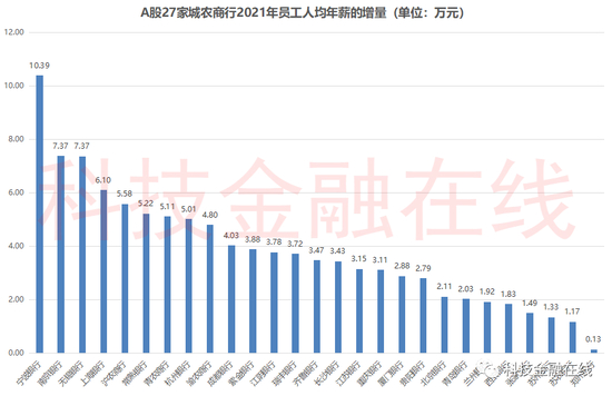 如果从人均年薪的变化量来看,27家上市银行2021年的人均年薪较上年同期相比,都出现了一定程度地上涨。