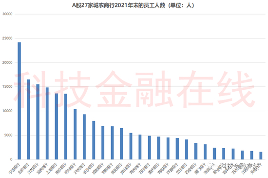 通过梳理发现,截至2021年末,A股27家上市城农商行拥有的员工人数合计达19.87万人,较上年末净增7333人,增幅为3.83%。